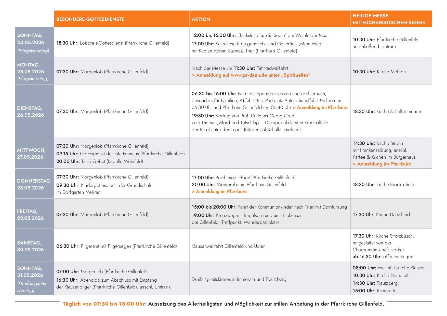 Die „Aktionswoche lebendiger Glaube“ beginnt mit dem Hochamt am Pfingstsonntag, 24. Mai 2026 und endet am Dreifaltigkeitssonntag, 31. Mai 2026.